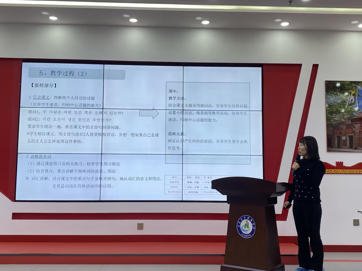 参赛过程中,张慧莲老师紧扣赛事要求,围绕指定教材内容,系统设计了融合思政教育的完整教学方案,精心制作了配套课件与教学视频。在作品呈现中,她以清晰的双语表达(中文说课、韩语授课),生动展示了如何将价值引领有机融入语言教学,实现知识传授、能力培养与思政育人的深度融合。其教学设计结构严谨、素材丰富、方法创新,充分体现了“课程思政”在外语教学中的自然渗透与有效实践,获得了评审专家的高度评价。
